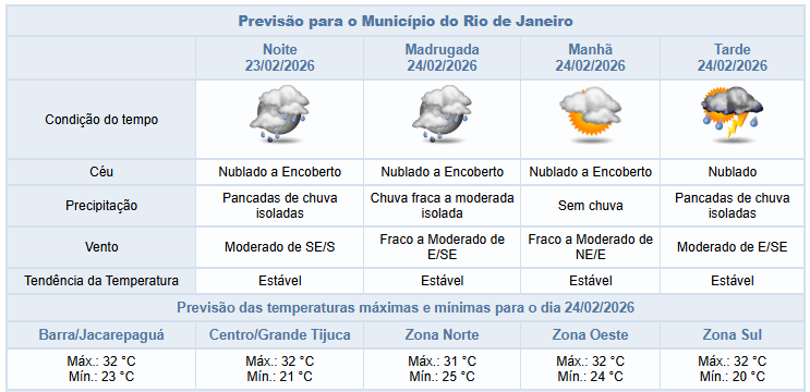 Segundo o Alerta Rio, a previsão para a noite desta segunda-feira (23/2) é de pancadas de chuva isoladas, com ventos moderados e céu nublado a encoberto. Ao longo do dia, o tempo na cidade foi influenciado por áreas de instabilidade associadas à uma região de baixa pressão. Houve registro de pancadas de chuva muito forte, acompanhadas de raios, em bairros das Zonas Norte e Oeste. Os ventos estiveram moderados e as temperaturas permaneceram estáveis, com mínima registrada de 21,5°C e máxima de 32,1°C.