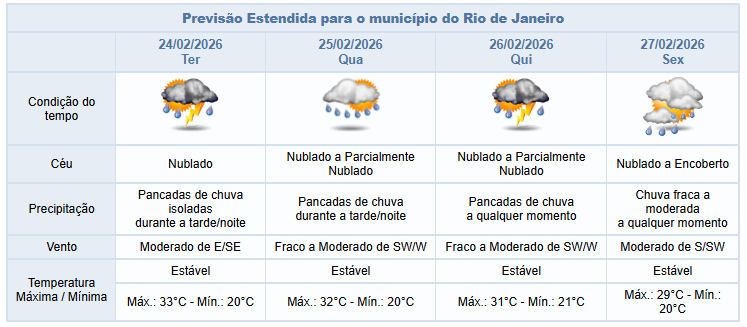 Na quinta e sexta-feira (26/2 e 27/2), em função da formação e posterior atuação de um sistema de baixa pressão no litoral do Rio de Janeiro, a previsão para a capital fluminense é de nebulosidade variada e chuva fraca a moderada e acompanhada de raios a partir da tarde de quinta-feira.