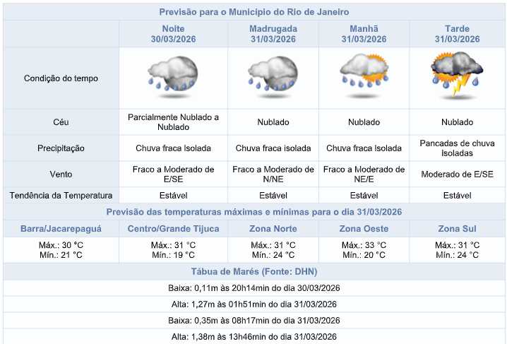 Na terça-feira (31/03), áreas de instabilidade associadas a uma região de baixa pressão em conjunto com a entrada de ventos úmidos do oceano influenciarão o tempo na cidade do Rio. Assim, a nebulosidade estará variada e a previsão é de chuva fraca isolada na madrugada/manhã, passando a pancadas isoladas de chuva moderada a partir da tarde. Os ventos estarão predominantemente moderados.