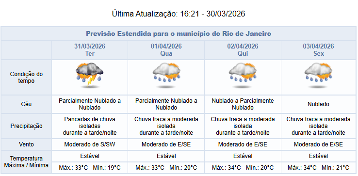 Entre quarta e sexta-feira (01/04 e 03/04), a previsão para a cidade do Rio é de céu parcialmente nublado a nublado com chuva fraca a moderada isolada na tarde/noite destes dias. Os ventos estarão moderados.