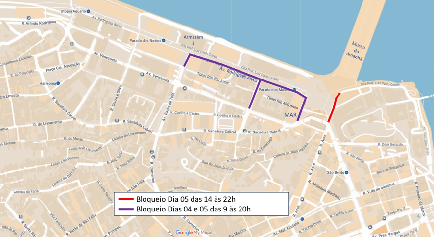 Dias 3, 4 e 5/11 (de segunda a quarta-feira) – A Av. Rodrigues Alves, no trecho entre a Rua Souza e Silva e a Praça Mauá terá acesso restrito.