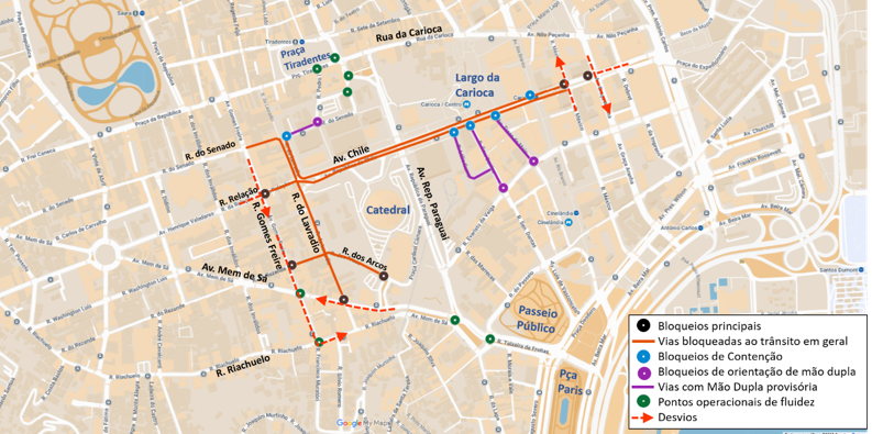 Durante o período, alterações momentâneas serão necessárias em algumas ruas para garantir a fluidez do trânsito. Haverá interdições viárias temporárias nas proximidades dos principais eventos – Aterro do Flamengo, Praça Mauá, Praça Tiradentes e Avenida República do Chile -, nas vias da orla, onde se concentram hotéis de delegações, e nas regiões dos aeroportos.