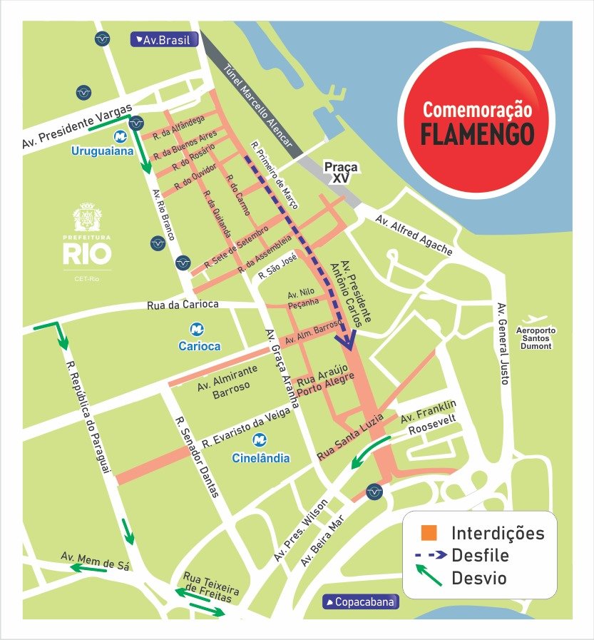 O Centro de Operações e Resiliência da Prefeitura do Rio (COR-Rio), informa que a Prefeitura do Rio preparou um esquema operacional especial para a festa da torcida do Flamengo, pelo quarto título da Copa Libertadores. Na manhã deste domingo (30/11), a Rua Primeiro de Março e a Avenida Presidente Antônio Carlos, no Centro da cidade, serão interditadas para que os rubro-negros recebam os campeões da América, que irão desfilar em trio elétrico em um percurso de 850 metros.