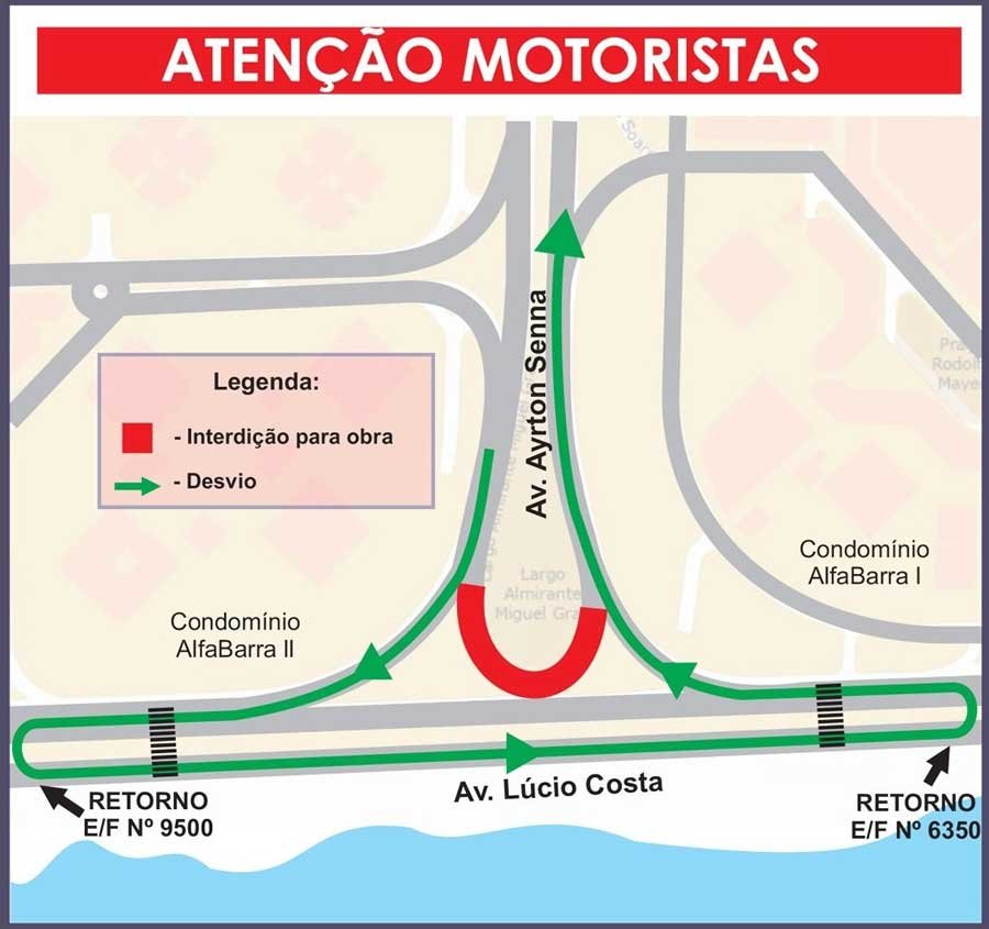 • Com o fechamento do retorno, os motoristas deverão seguir pela Avenida Lúcio Costa e utilizar outros retornos existentes ao longo da via.