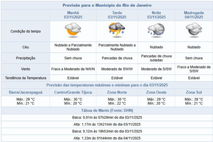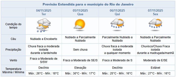 Na terça-feira (04/11), o tempo na cidade do Rio será influenciado pela entrada de ventos úmidos do oceano. Haverá predomínio de céu nublado e previsão de chuva fraca a moderada, isolada, à tarde e à noite. Os ventos estarão fracos a moderados e as temperaturas apresentarão declínio.