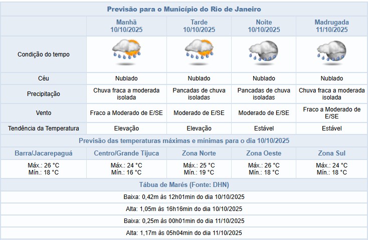 Segundo o Alerta Rio, o predomínio será de céu nublado na cidade do Rio de Janeiro nesta sexta-feira (10/10), com previsão de chuva fraca a ocasionalmente moderada, isolada, pela manhã; e pancadas isoladas de chuva a partir da tarde. O tempo será influenciado por áreas de instabilidade e pela entrada de ventos úmidos do oceano. Ventos predominantemente moderados, principalmente no litoral e a partir da tarde. Temperaturas em elevação, com mínima prevista de 16ºC, e máxima prevista de 26ºC.