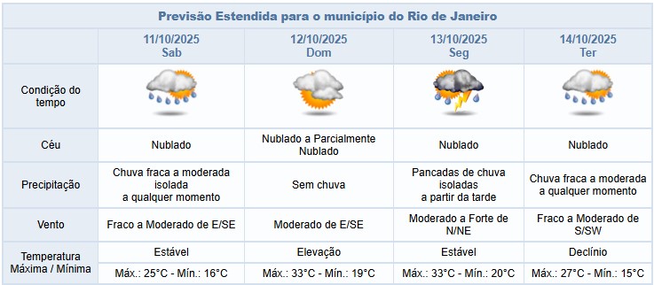No sábado (11/10) o tempo permanecerá instável na cidade do Rio. O céu estará nublado e a previsão é de chuva fraca a ocasionalmente moderada, isolada, até o período da tarde, passando a chuva fraca no período da noite. Os ventos estarão fracos a moderados.