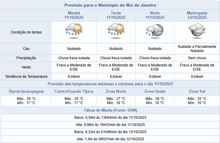 Segundo o Alerta Rio, há previsão de chuva fraca, isolada, ao longo deste sábado (11/10), na cidade do Rio de Janeiro. Ventos úmidos do oceano vão influenciar o tempo, deixando o céu predominantemente nublado. Ventos fracos a moderados. Temperaturas estáveis, mínima prevista de 17°C, e máxima prevista de 27°C.