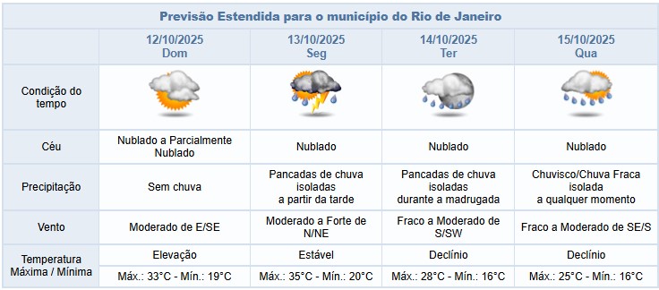Na terça-feira (14/10), devido ao transporte de umidade do oceano em direção ao continente, a previsão para a cidade do Rio é de céu predominantemente nublado com pancadas isoladas de chuva no período da madrugada, passando a chuva fraca a moderada, isolada, a partir do período da manhã. Os ventos estarão fracos a moderados.