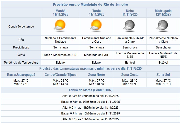Segundo o Alerta Rio, céu com nebulosidade variada nesta terça-feira (11/11), na cidade do Rio de Janeiro, sem previsão de chuva. Um sistema de alta pressão influencia o tempo no município. As temperaturas seguem estáveis, com máxima prevista de 28°C. Os ventos vão variar entre fracos a moderados.