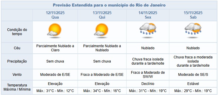 Na quarta-feira (12/11), e na uinta-feira (13/11), a nebulosidade estará variada na cidade do Rio e não há previsão de chuva. Os ventos estarão variando entre fracos a moderados.