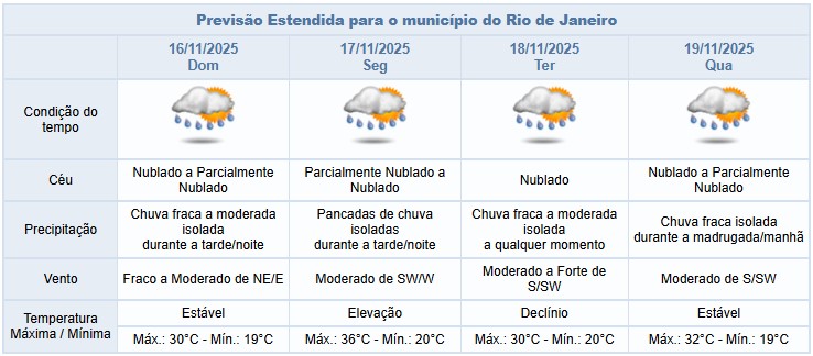 No domingo (16/11), áreas de instabilidade em médios níveis da atmosfera influenciarão o tempo na cidade do Rio. A nebulosidade estará variada, com predomínio de céu nublado e previsão de chuva fraca a moderada, isolada, na tarde e à noite. Os ventos estarão variando entre fracos a moderados.