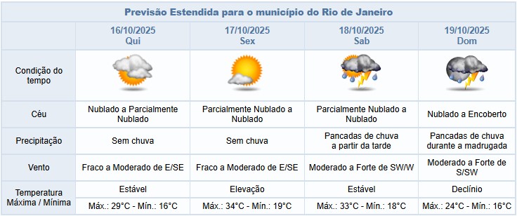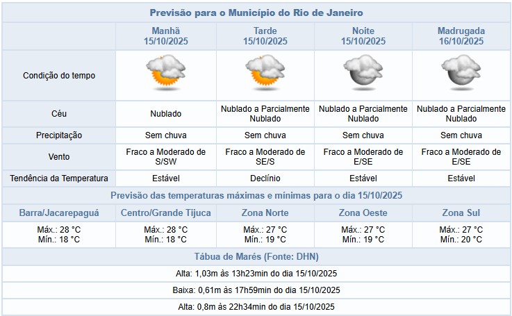 Segundo o Alerta Rio, não há previsão de chuva nesta quarta-feira (15/10), na cidade do Rio de Janeiro. O tempo será influenciado por ventos úmidos do oceano, deixando o céu com nebulosidade variada. Temperaturas em declínio, com máxima prevista de 28°C. Os ventos estarão fracos a moderados.