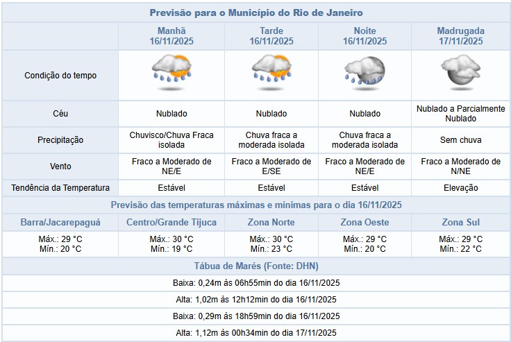 Segundo o Alerta Rio, há possibilidade de chuvisco a chuva fraca, isolada, na manhã; e chuva fraca a moderada, isolada, a partir da tarde deste domingo (16/11), na cidade do Rio de Janeiro. O céu estará predominantemente nublado. Temperaturas estáveis, com máxima prevista de 30°C. Os ventos estarão fracos a moderados.