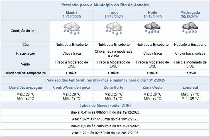 Segundo o Alerta Rio, há previsão de chuva fraca ao longo desta sexta-feira (19/12), sendo moderada, isolada, à tarde, na cidade do Rio de Janeiro. Ventos úmidos do oceano e um canal de umidade ao norte do estado deixam o céu nublado a encoberto. Os ventos vão estar fracos a moderados. Temperaturas estáveis, com máxima prevista de 28°C.