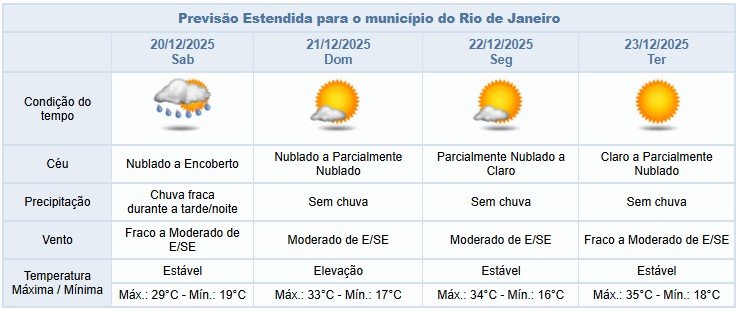No sábado (20/12), o tempo seguirá instável na cidade do Rio, com nebulosidade variada e previsão de chuva fraca à tarde e à noite. Os ventos estarão fracos a moderados.