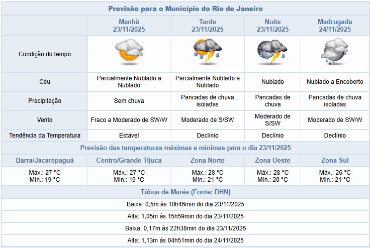 Na quarta-feira (26/11), em função da entrada de ventos úmidos do oceano, a previsão para a cidade do Rio é de céu predominantemente nublado com chuva fraca, isolada, a qualquer momento. Os ventos estarão predominantemente moderados.