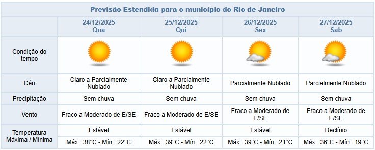 Entre a quarta-feira (24/12) e sábado (27/12), a previsão para a cidade do Rio de Janeiro é de céu claro a parcialmente nublado e sem chuva. Os ventos estarão fracos a moderados e as temperaturas permanecerão estáveis e elevadas.