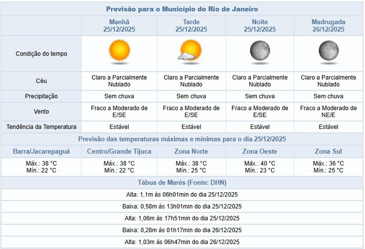 Segundo o Alerta Rio, o dia de Natal (25/12) será de temperaturas elevadas na cidade do Rio de Janeiro, com previsão de temperatura máxima de 40ºC. Predomínio de céu claro e sem previsão de chuva. Ventos fracos a moderados.