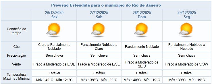 Entre a sexta-feira (26/12) e a segunda-feira (29/12), a previsão para a cidade do Rio de Janeiro é de céu claro a parcialmente nublado e sem chuva. Os ventos estarão fracos a moderados e as temperaturas permanecerão elevadas.