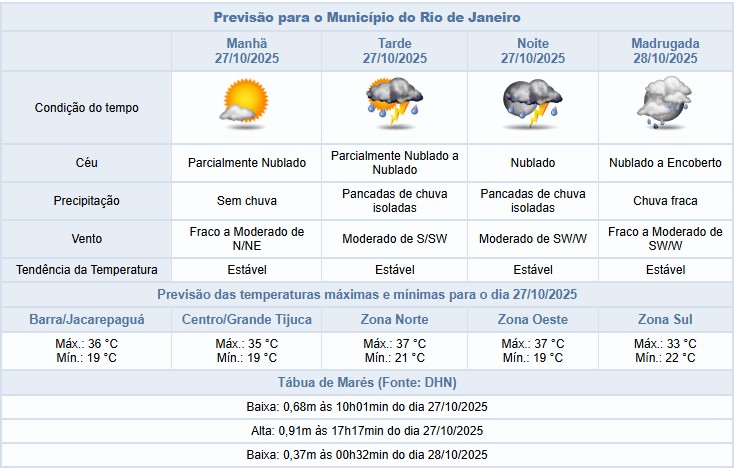 Segundo o Alerta Rio, há previsão de pancadas isoladas de chuva a partir da tarde desta segunda-feira (27/10), na cidade do Rio de Janeiro, podendo vir com raios. Um sistema de baixa pressão no litoral influencia o tempo. Ao longo do dia, haverá aumento gradativo da nebulosidade. Os ventos estarão moderados, sendo mais intensos à tarde. As temperaturas permanecerão elevadas, com máxima prevista de 37°C.