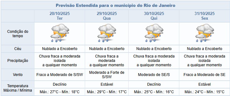 Na terça-feira (28/10), a aproximação de uma frente fria no oceano influenciará o tempo na cidade do Rio. O céu estará nublado a encoberto e a previsão é de chuva isolada, fraca a moderada, a qualquer momento. Os ventos estarão moderados, e as temperaturas apresentarão declínio. Os ventos estarão variando entre fracos e moderados.