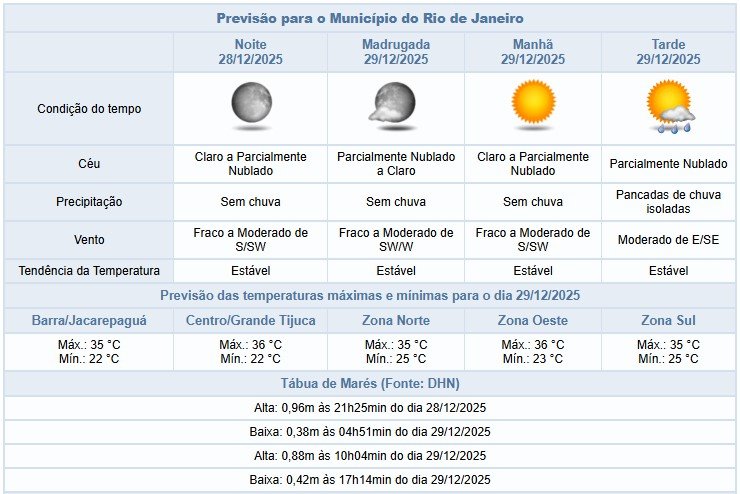 Segundo o Alerta Rio, a previsão para a noite deste domingo (28/12), na cidade do Rio de Janeiro, é de céu claro a parcialmente nublado, sem previsão de chuva. Ventos fracos a moderados.
