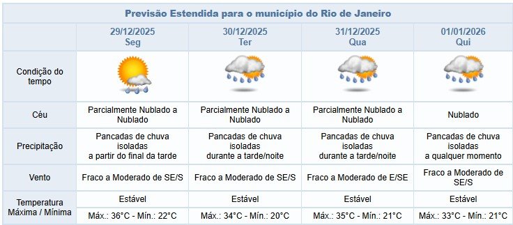 Na segunda-feira (29/12), áreas de instabilidade associadas ao calor vão influenciar o tempo na cidade do Rio. A nebulosidade estará variada e há previsão de pancadas isoladas e rápidas de chuva a partir do final da . Os ventos estarão fracos a moderados.