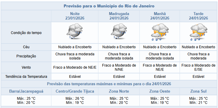 Segundo o Alerta Rio, a previsão para a noite desta sexta-feira (23/1) é de céu nublado a encoberto, com chuva fraca a moderada e ventos fracos a moderados. Ao longo do dia, o tempo se manteve instável na cidade. O céu esteve nublado a encoberto e houve registro de chuva fraca a moderada. Os ventos ficaram fracos a moderados e as temperaturas permaneceram estáveis em relação ao dia anterior, com mínima registrada de 19,1°C e máxima registrada de 23,7°C.