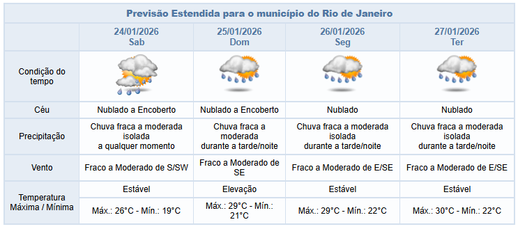 Entre o domingo (25/1) e a terça-feira (27/1), o tempo segue instável devido à atuação de um canal de umidade, com previsão de céu nublado e chuva fraca a moderada a partir da tarde destes dias. Os ventos estarão fracos a moderados com temperaturas se elevando gradualmente.