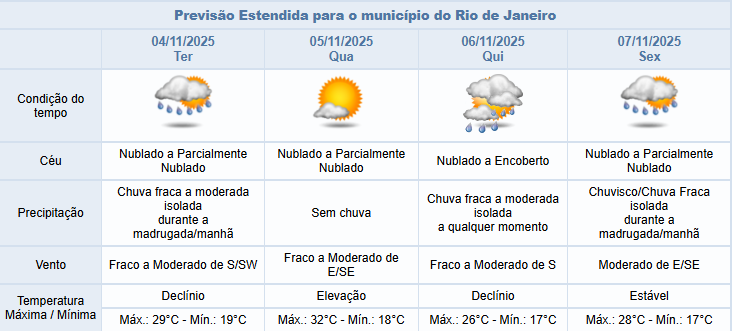 Na quinta-feira (06/11), em função do deslocamento de uma frente fria pelo oceano e entrada de umidade marítima no continente, a previsão para a cidade do Rio é de nebulosidade variada com chuva fraca a moderada isolada a qualquer momento. Os ventos estarão fracos a moderados e as temperaturas em declínio.