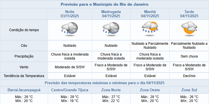 De acordo com o Sistema Alerta Rio, na noite desta segunda-feira (03/11), o tempo no Rio segue instável. Para hoje, há previsão de céu nublado e possibilidade de chuva fraca, ocasionalmente moderada isolada. Os ventos estarão fracos a moderados.