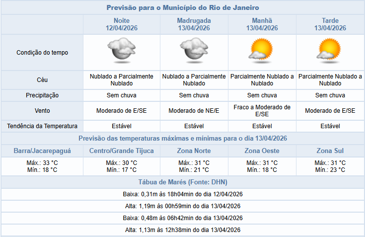 Segundo o Alerta Rio, o final de tarde e a noite de domingo (12/04) será com nebulosidade variada na cidade do Rio de Janeiro, sem previsão de chuva. Os ventos estarão ocasionalmente moderados.