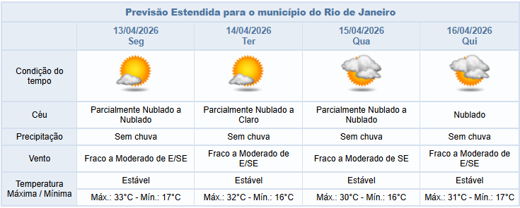 Entre a segunda-feira (13/04) e a quinta-feira (16/04), há previsão é de nebulosidade variada na cidade do Rio de Janeiro, sem previsão de chuva. Os ventos estarão fracos a moderados.