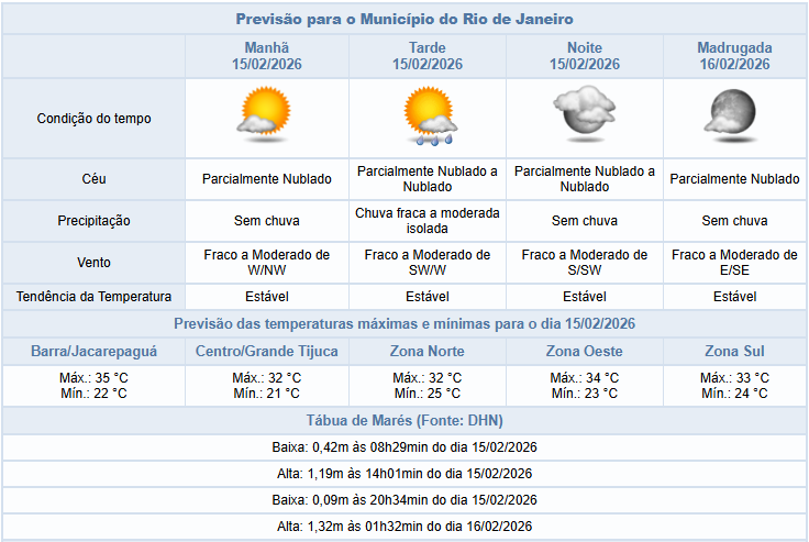 Segundo o Alerta Rio, há possibilidade de chuva isolada, fraca a moderada, na tarde deste domingo (15/02), na cidade do Rio de Janeiro. O tempo será influenciado pelo calor e a alta disponibilidade de umidade, deixando o céu parcialmente nublado a nublado. Temperaturas estáveis, com máxima prevista de 34°C. Ventos fracos a moderados.