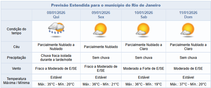 Entre sexta-feira (09/01) e domingo (11/01), haverá redução de nebulosidade na cidade do Rio e não há previsão de chuva. Os ventos estarão fracos a moderados, sendo mais intensos no sábado. As temperaturas estarão elevadas.