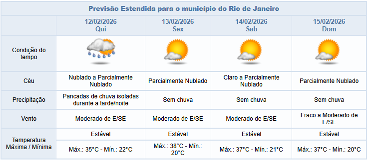 A quinta-feira (12/02) será ainda de tempo instável na cidade do Rio. A nebulosidade estará variada, com céu parcialmente nublado a nublado e previsão de pancadas de chuva a partir da tarde. Os ventos estarão fracos a moderados e as temperaturas apresentarão gradativa elevação.