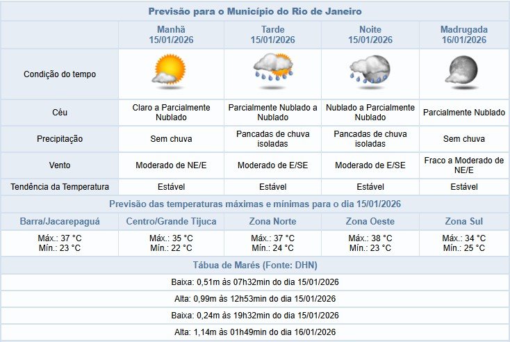 Segundo o Alerta Rio, há possibilidade de pancadas isoladas de chuva a partir da tarde desta quinta-feira (15/01), na cidade do Rio de Janeiro. O tempo segue influenciado por áreas de instabilidade associadas ao calor, deixando o céu parcialmente nublado. Temperaturas estáveis, com máxima prevista de 38°C. Os ventos estarão predominantemente moderados, principalmente na orla.