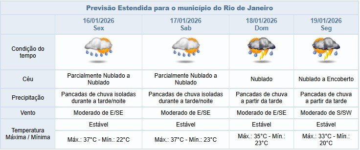 Entre a sexta-feira (16/01) e o sábado (17/01), a atuação de áreas de instabilidade associadas ao calor influenciarão o tempo na cidade do Rio de Janeiro. A previsão é de céu parcialmente nublado a nublado, com pancadas isoladas de chuva a partir da tarde destes dias. Os ventos estarão predominantemente moderados.