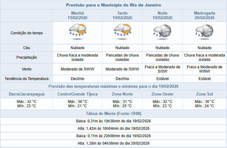Segundo o Alerta Rio, há possibilidade de pancadas isoladas de chuva a partir da tarde desta quinta-feira (19/02), na cidade do Rio de Janeiro; a partir da manhã já há previsão de chuva fraca a moderada, isolada. O tempo será influenciado pela passagem de uma frente fria pelo litoral. Temperaturas em declínio, com máxima prevista de 31ºC. Ventos fracos a moderados.