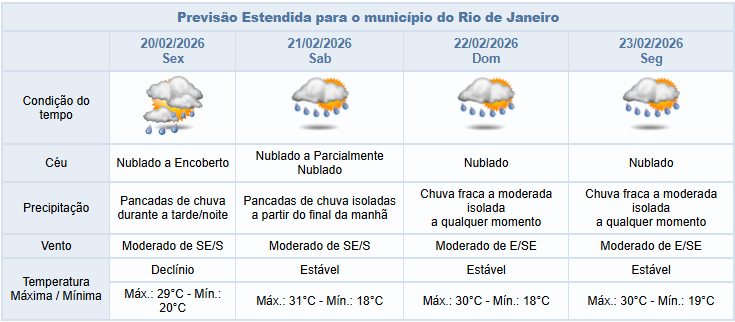 Na sexta-feira (20/02) e no sábado (21/02), por conta da passagem desta frente fria pela costa do estado do Rio de Janeiro, a previsão para a cidade do Rio é de chuva fraca a moderada a qualquer momento destes dias, com pancadas a partir da tarde. Os ventos estarão variando entre fracos e moderados.