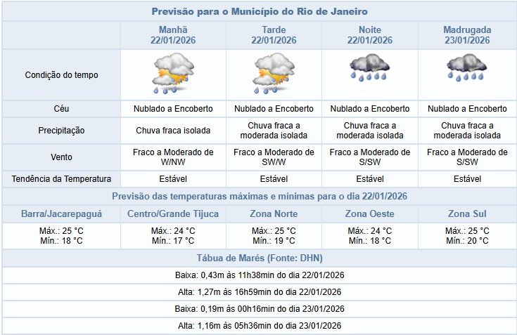 Segundo o Alerta Rio, há possibilidade de chuva fraca a qualquer momento desta quinta-feira (22/1), na cidade do Rio de Janeiro, sendo moderada, isolada, a partir da tarde. O tempo segue instável devido a um canal de umidade e um sistema de baixa pressão na costa, deixando o céu nublado a encoberto. Temperaturas estáveis, com máxima prevista de 25°C. Ventos fracos a moderados.
