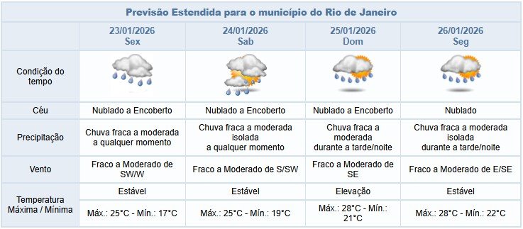 Entre a sexta (23/1) e a segunda-feira (26/1), a atuação da Zona de Convergência do Atlântico Sul (ZCAS) sobre a Região Sudeste manterá o tempo instável na cidade do Rio de Janeiro. O céu estará nublado a encoberto e a previsão é de chuva fraca a moderada a qualquer momento da sexta-feira e do sábado, e na tarde e noite do domingo e da segunda-feira. Os ventos estarão fracos a moderados.