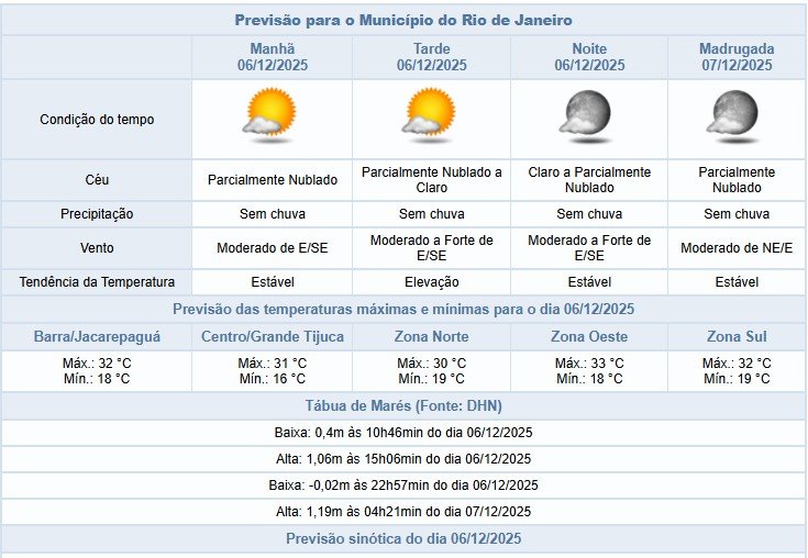 Segundo o Alerta Rio, haverá redução de nebulosidade no céu da cidade do Rio de Janeiro, neste sábado (06/12), sem previsão de chuva. O tempo será influenciado por um sistema de alta pressão. Os ventos vão estar predominantemente moderados, sendo ocasionalmente fortes no litoral, a partir da tarde. Temperaturas em elevação, com mínima prevista de 16°C, e máxima prevista de 33°C.