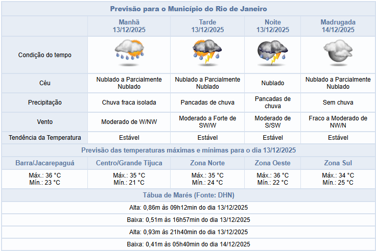 Segundo o Alerta Rio, há possibilidade de pancadas de chuva a partir da tarde deste sábado (13/12), na cidade do Rio de Janeiro, podendo ser acompanhadas de raios e rajadas de vento moderado, ocasionalmente forte. O tempo ficará instável devido ao calor e a alta disponibilidade de umidade. As temperaturas seguirão elevadas, com máxima prevista de 36°C.