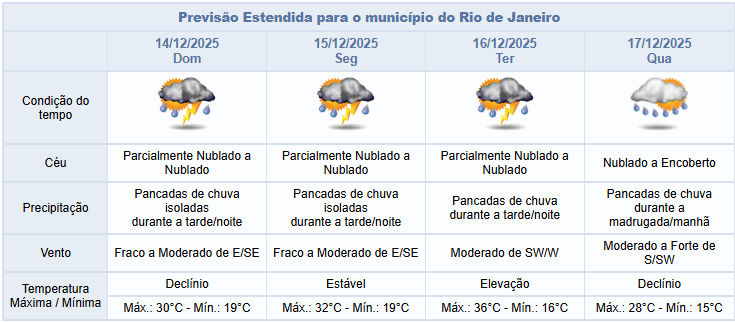 No domingo (14/12), a atuação de áreas de instabilidade vão manter o tempo instável no Rio, com céu parcialmente nublado a nublado e pancadas isoladas de chuva na madrugada e a partir da tarde, acompanhadas de raios. Os ventos estarão variando entre fracos e moderados.