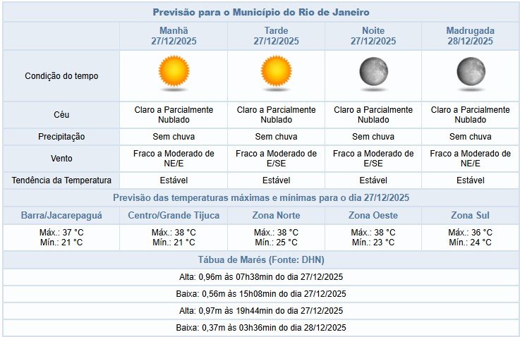 Segundo o Alerta Rio, o sábado (27/12), na cidade do Rio de Janeiro, será de céu claro a parcialmente nublado, sem previsão de chuva. Temperaturas elevadas, com máxima prevista de 38°C. Ventos variando entre fracos e moderados.