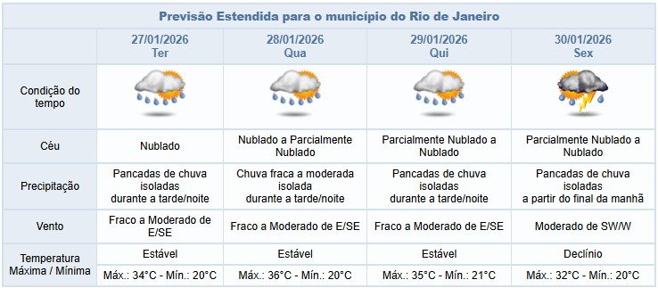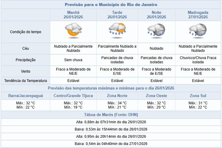 Segundo o Alerta Rio, há possibilidade de pancadas de chuva a partir da tarde desta segunda-feira (26/01), na cidade do Rio de Janeiro, com céu nublado a parcialmente nublado. O tempo segue instável, influenciado pela atuação de um canal de umidade associada ao calor. Temperaturas estáveis, com mínima prevista de 19ºC, e máxima prevista de 34°C. Ventos fracos a moderados.