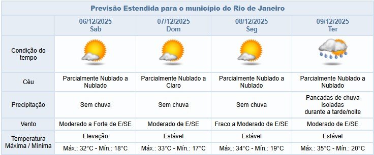 Entre sábado (06/12) e segunda-feira (08/12), haverá redução gradativa de nebulosidade na cidade do Rio e não há previsão de chuva. Os ventos estarão variando entre fracos e moderados, podendo ser pontualmente fortes no sábado (06/12) e as temperaturas apresentarão elevação.