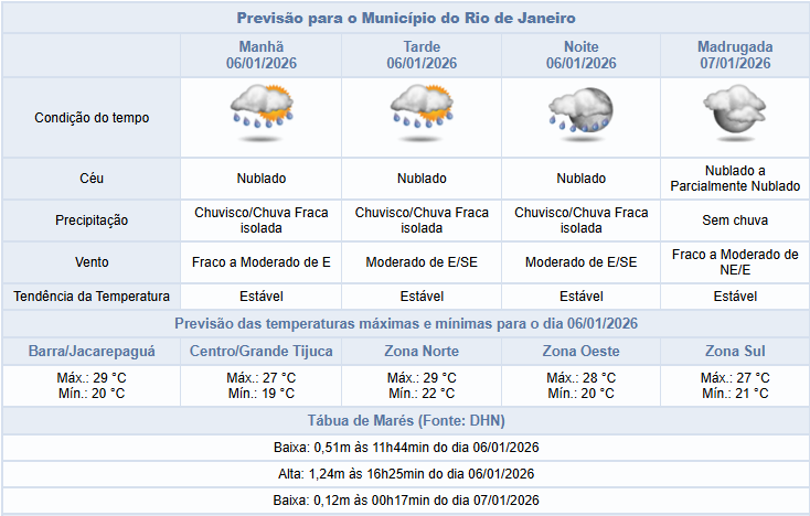 Segundo o Alerta Rio, há possibilidade de chuvisco/chuva fraca isolada, a qualquer momento desta terça-feira (06/01), na cidade do Rio de Janeiro, devido à entrada de ventos úmidos do oceano. O tempo segue instável, deixando o céu nublado. Ventos predominantemente moderados, principalmente a partir da tarde. Temperaturas estáveis, com mínima prevista de 19°C, e máxima prevista de 29°C.